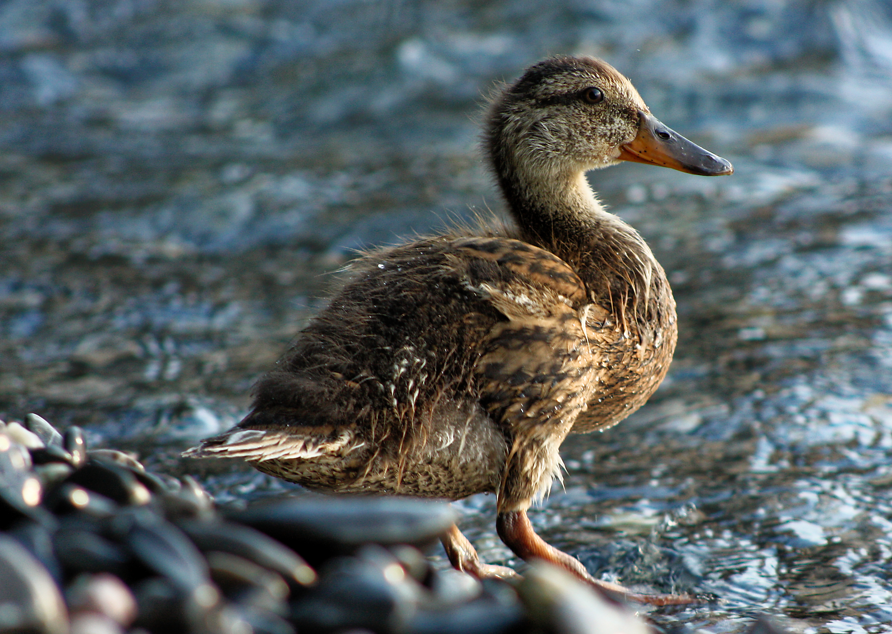 Portrait of a young and curious Mallard duckling, resting on the shore and waiting for mom.